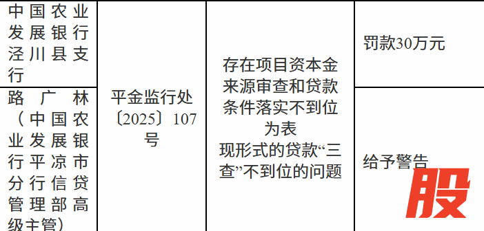 1月4日,国家金融监督管理总局平凉监管分局行政处罚信息公示表显示,中国农业发展银行泾川县支行因存在项目资本金来源审查和贷款条件落实不到位为表现形式的贷款“三查”不到位的问题被罚款30万元;路某林被警告。