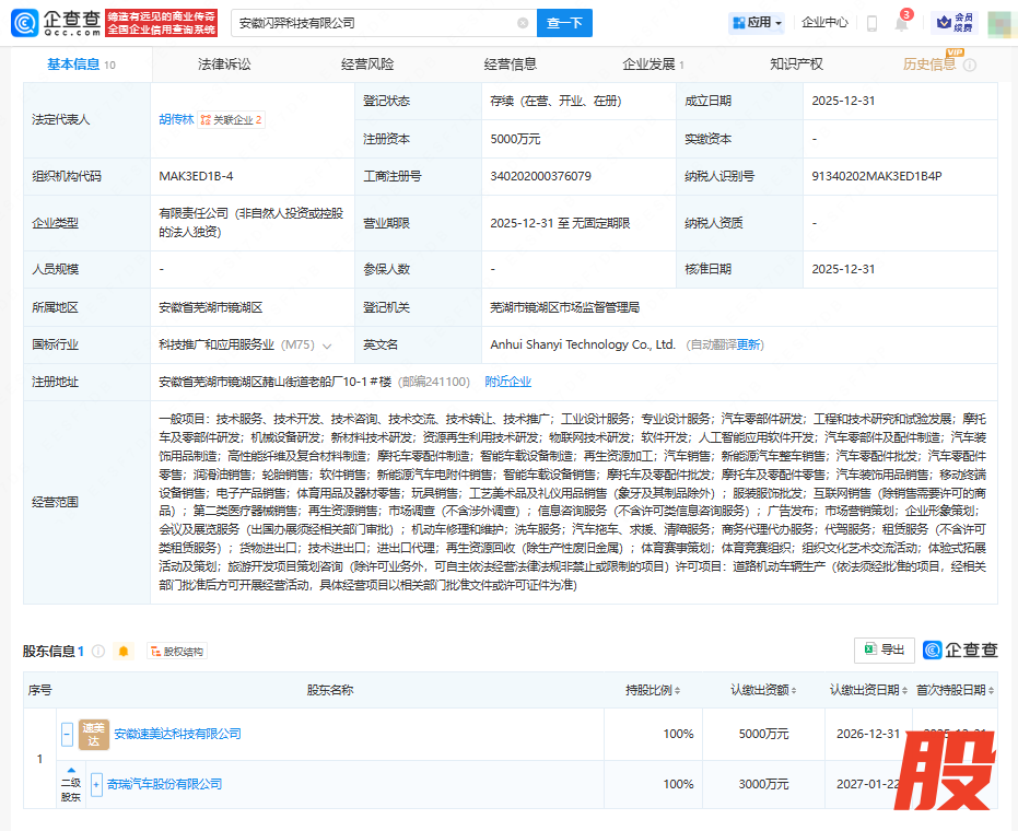 近日,安徽闪羿科技有限公司成立,法定代表人为胡传林,注册资本5000万人民币,经营范围涉及摩托车及零部件研发、资源再生利用技术研发、物联网技术研发、人工智能应用软件开发等。企查查股权穿透显示,该公司由奇瑞汽车(09973.HK)间接全资持股。